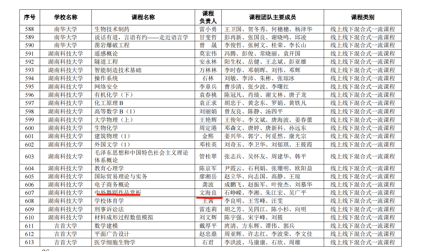 国产自拍由彭浩宇老师负责的混合式课程《基本乐理(2)》、文海良老师负责的混合式课程《中外舞蹈作品赏析》、张然老师负责的线上课程《湖南民间传统舞蹈传承》均获湖南省一流课程立项建设。