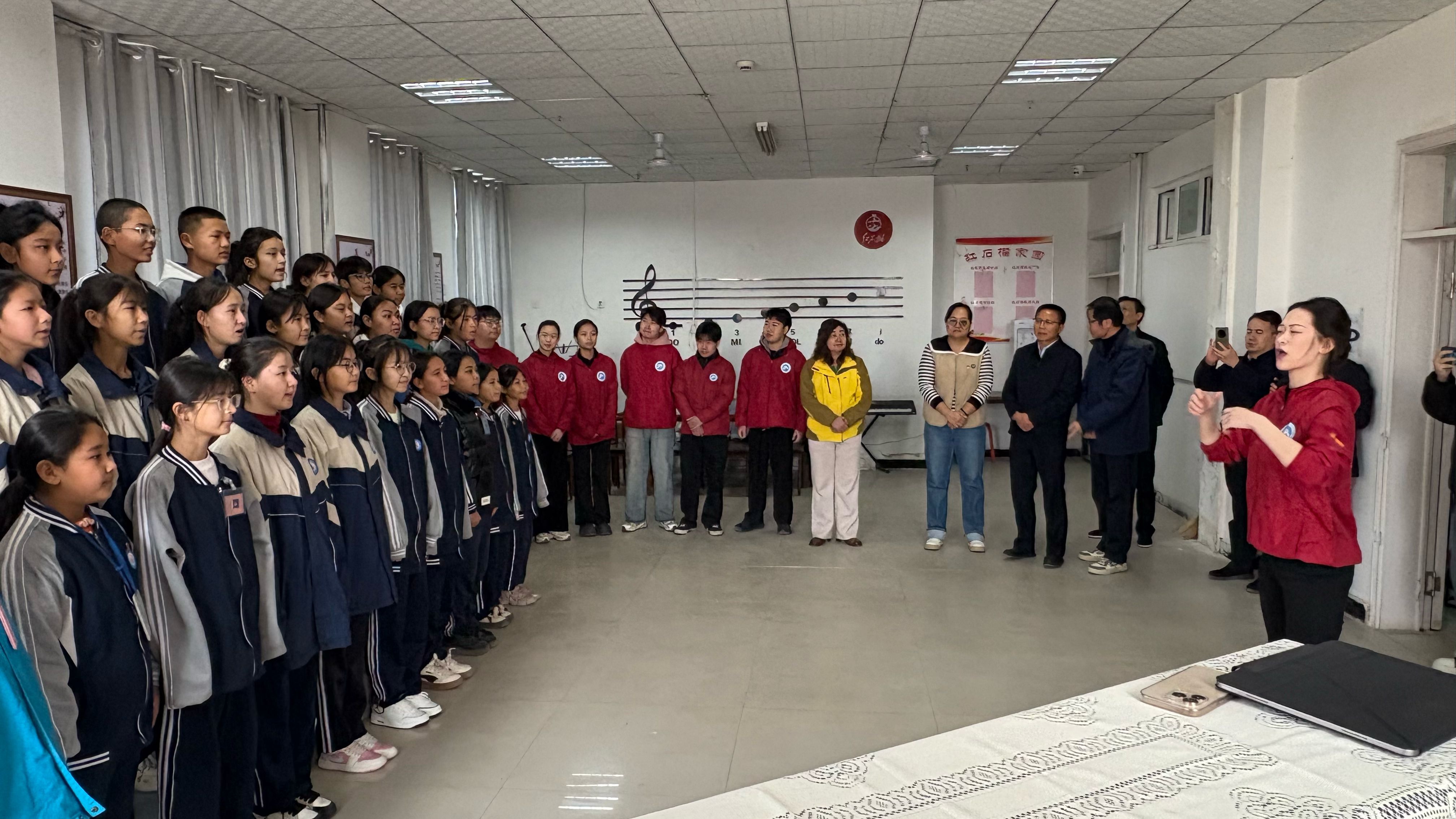 代表团实地观摩了“心与馨”志愿支教服务队的合唱课堂教学,课堂上,支教老师教学方法灵活、富有感染力,学生们精神饱满、歌声嘹亮,展现了良好的艺术素养和精神风貌。代表团对生动的教学形式与显著的教学成效给予高度评价,现场掌声热烈,除此之外还参观了校园的活动场所,全面了解援疆学生的学习条件与工作成果。